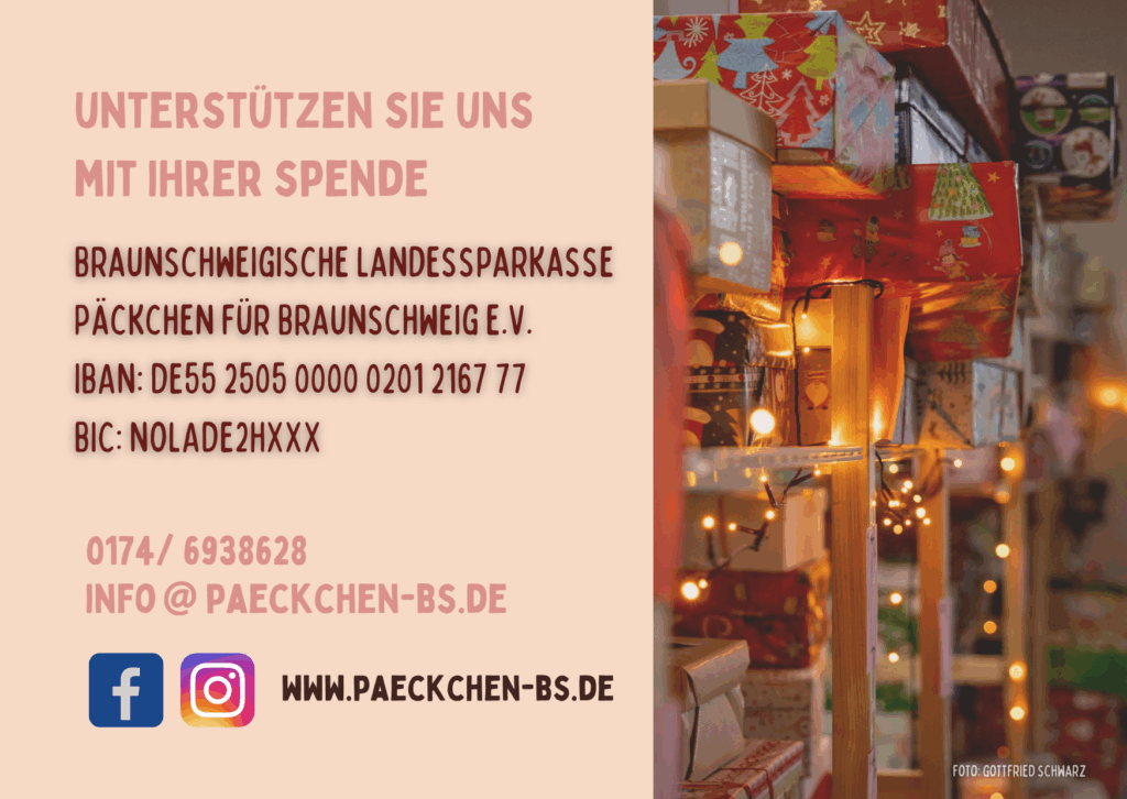 Päckchen für Braunschweig e.V.Die Aktion "Päckchen für Braunschweig" geht 2024 weiter!Päckchen für Braunschweig e.V.Die Aktion "Päckchen für Braunschweig" geht 2024 weiter! Vorheriger Slide Nächster Slide Jedes Jahr Gutes tun! 2024 konnten wir über 3500 Weihnachtsgeschenke weitergeben! Danke für die zahlreiche Unterstützung! Der Verein Mehr erfahren Infos zur Aktion Mehr erfahren Presse Mehr erfahren Weitere Informationen finden Sie hier. Unsere Sammelstandorte Aktuelles 04/11/2024 2024 Weiterlesen 20/09/2024 2024 in den Startlöchern Weiterlesen 18/05/2024 4130 Päckchen Weiterlesen Unsere Partner Wir danken unseren Partnern für ihre Spenden! Voriger Nächster Kontakt Wir sind für alle Fragen offen und nehmen gerne jegliche Rückmeldung an. 0174/ 6938628 info@paeckchen-bs.de Facebook Instagram Dein Name Deine E-Mail-Adresse Einrichtung/Firma Betreff Deine Nachricht (optional) Die Datenschutzerklärung habe ich zur Kenntnis genommen Bitte lasse dieses Feld leer.